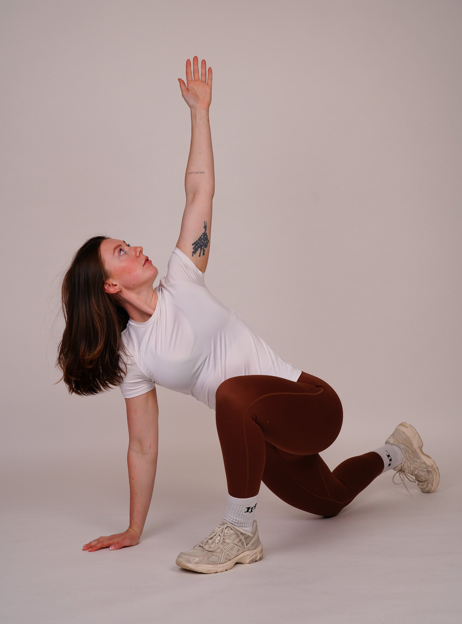 Colour Disclaimer: The Balance Fitted-T in 'Bright White' was designed to layer over your sports bra. We wanted to keep it light weight for you, so you may be able to see some (especially darker colours) subtly beneath the white. If you prefer a complete opaque look, take a look at our other colour-ways: Jet Black or Cocoa Brown.